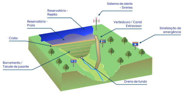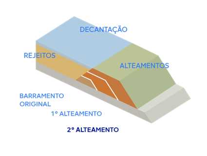 A barragem de rejeitos é uma estrutura projetada, construída pelo método à jusante, o que significa que as paredes do reservatório são reforçadas mediante a deposição de solo argiloso compactado desde a base até a altura planejada (mais camadas), na parede externa do barramento.