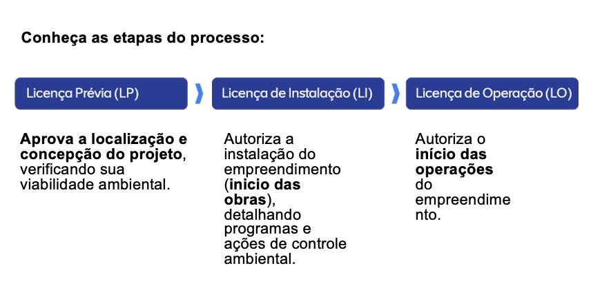 A Licença de Instalação (LI) e a Licença de Operação (LO) são as etapas seguintes à obtenção da Licença Prévia (LP). A Licença de Instalação autoriza a instalação do empreendimento, atividade ou obra, de acordo com as especificações constantes dos planos, programas e projetos aprovados, fixando cronograma para execução das medidas mitigadoras e da implantação dos sistemas de controle ambiental.